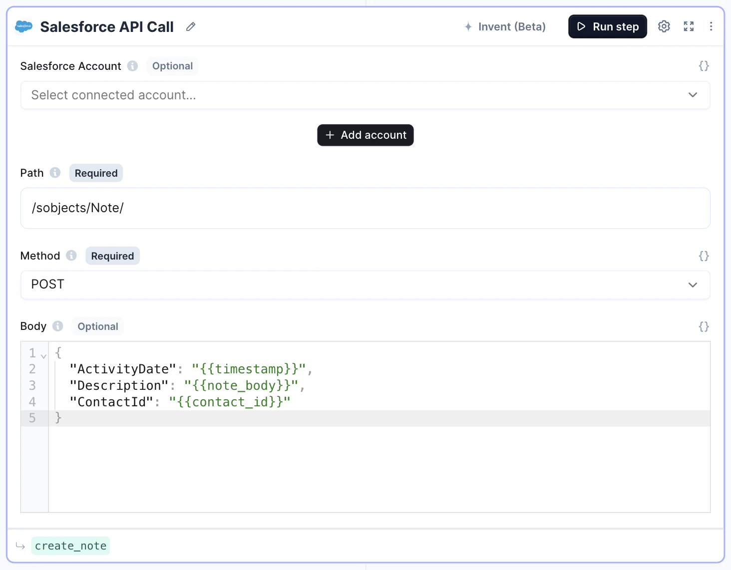 Once your account is connected, you can use the Salesforce API call step in the Tool builder. This tool step allows you to complete Salesforce-specific activities, like managing Leads, Contacts, Notes, Tasks and more.Use Salesforce API tool-step